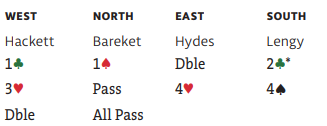 Utspillet gikk til liten, tieren og esset. Hjerterfinessen måtte gå, men vest dekker selvsagt hjerter knekt og det blir ikke noe avkast fra den fargen. Dermed må kløver konge sitte hos øst (eller det kan spilles på kongen dobbel hos vest). Det ble en bet med to kløvertapere, 17 IMP til ZELIGMAN.