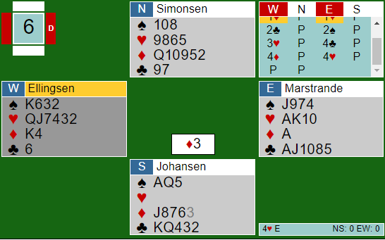 Vi fulgte kampen mellom det to sterke lagene "God (Gammel) årgang" og "Steng Oslo" - og Elllingsen-Marstrander meldte seg opp i det som ser ut som den normale utgangen 4 hjerter. Det er vel endel som risikerer å havne i 4 spar med slikt etter starten 1 kløver-1 hjerter, 1 spar (eller 2 spar), men Ø/V ved dette bordet bruket overføringer over 1 kløver, og da øst etter 1 ruter sa 1 hjerter (trekorts hjerter) endte de etter litt om og men i 4 hjerter. Det er bedre i hjerterkontrakt her, men det bør bli de samme stikkene i sparkontrakt slik det sitter.