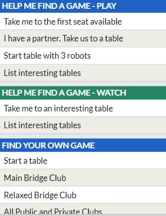 Det går an å spille tidligere spilte vu-graph overførte lagkamper hvor resultatene ved ditt bord blir sammenlignes med det som ble gjort av toppspillere. Å bruke roboter som motspillere ved ditt bord er ikke et så dårlig alternativ. De er ikke dårlige spillere, men gjør enkelte merkelige ting - hvem gjør ikke det. De er imidlertid ganske konsekvente og er kodet med et meldesystem de følger ganske bra. Du kan når som helt klikke på meldingene deres for å få vite hva de betyr. Dessuten er robotene tålmodige "folk". Hvis du tar en kaffepause eller noe sånt, eller du og makker har lyst til å diskutere noe venter de uten å klage...