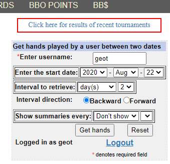 Dette finnes på åpningssiden før du logger inn til selve portalen hvor spillingen foregår. Idet du klikker på "hand records" får du frem dette: