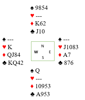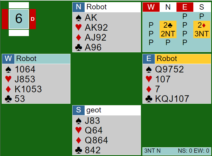 Øst får både for kløver konge og kløver dame i neste stikk, og nord vinner med kløver ess i tredje stikk. Vest hadde dobbel kløver fra start og kastet en spar i tredje kløverrunde.