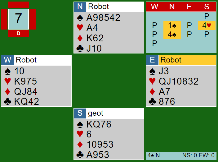 Uansett, kontrakten ble 4 spar spilt av nord ved vårt bord.