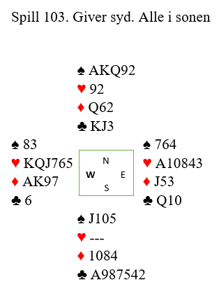 To par havnet i hjerterslem hvor det var to tapere. Det ene N/S-paret som var så heldig å sitte mot 6 hjerter doblet slemmen! Det var farlig business, for det ga Ø/V sjanse, og de burde antagelig "rømt" til 6 grand?