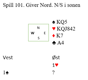 La oss si du sier 2 spar. Vest hopper direkte til 4 hjerter. Det går to passer tilbake til syd. Melder du noe mer nå?