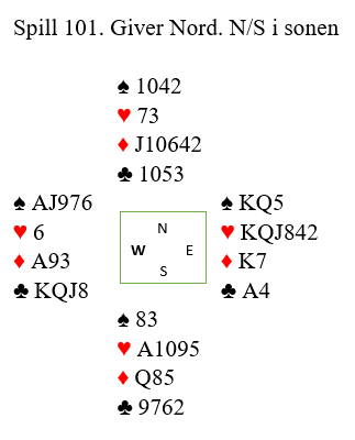 Arild fyrte av kl A men den kunne jo Jon stjele. Så kom sp K fulgt av ny spar der damen beleilig dukket opp dobbel hos Olsen og kongen vant. Hj 10 stakk Øyvind med esset som felte hj K i Nord og nå var det bare taper for hj D i tillegg. Mitt ru A var det ikke bruk for. 11 stikk og +650 var jo topp. En morsomhet opplevde Morten Pettersen (N)- Ove Gundersen på samme spill. Ove åpnet med 1 kløver men her valgte Vest å gå innpå med 2 hjerter og etter holdsøk 3 hjerter Nordfra ble Gundersen spillefører i 3 grand. Vest spilte ut liten spar til makkers konge men så ble det snudd til hjerter og da hadde Syd plutselig 11 stikk. Ø-V kunne jo tatt 5 stikk direkte i spar og betet utgangen. Bridge er mangfoldig viser det seg stadig!