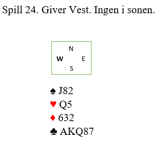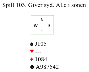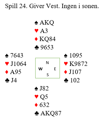 Hans Petter åpner jo med 1 spar og Jan P. meldte rolig 2 kløver for å høre mer om hva makker hadde. Da gjenmelding 2 spar kom kunne det vøre ren nødmelding, men 6- kort sparfarge er det ganske god odds for. Nå brukte Johannesen 5- ess Blackwood og fikk svar at makker hadde 2 ess+ to konger. Opptelling da var 5/6+3 + 2+ 2 men har Vest litt i tillegg, er det jo 13 stikk å få. Altså avsluttet Jan P. med 7 grand! Eneste faremoment er at sparen kan sitte 3-0 imot, men er Dxx i Syd kappes den jo opp. Bare husk å ta sp K først, er Nord da renons vet du hvordan du unngår taper til sp D. 13 stikk på «strak arm» siden trumfen hvis sparkontrakt var 2-1 imot.