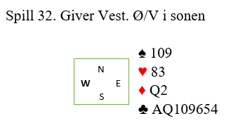 Hvis vi først ser på hvordan meldingen 3 kløver fungerer. Det er kun seks stikk i kløverkontakt Ø/V, altså -800 hvis man blir doblet. I praksis er det omtrent umulig med disse kortene N/S.