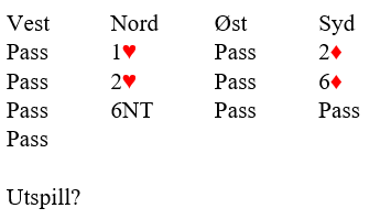 Jeg (N) åpnet med 1 hjerter, pass fra Morten Andresen (Ø) og svar 2 NT, krav Stenberg (med støtte i hjerter) fra Tone Annette (S) og gjenmelding 3 kløver, det viser god åpning og sidestyrke fra meg. Nå hoppet makker til 4 hjerter der det normalt ville kommet et cue- bid (kontroll av 1. og 2. i stigende rekkefølge) men jeg gikk likevel til 5-ess Balckwood, og på 4 NT fikk jeg svar 5 ruter som Bjørn Brovold (V) doblet. Med 6- kort hjerter er det her normalt ingen taper i trumf, men makkers hopp til 4 hjerter etter min styrkevisende 3 kløver tydet jo på relativt svak hånd og da ru A og K godt kunne mangle valgte jeg å avrunde med 5 hjerter. Ru 8 ut til A hos Bjørn og skift til spar. Som jeg vant på hånden. På hj A fulgte begge. Jeg spilte meg inn til blindemann i ruter, men på ny trumf var Brovold utsolgt. Da måtte Morten som hadde hatt hj D92 få stikk for trumfdamen og 11 stikk var alt å få. Heldig stopp før slem, i BBO- og vår turnering var flere i 6 hj og i 6 NT, ett par vant 6 hjerter (står uten ruter ut) også siden 2 NT- svaret normalt lover 4- kort trumfstøtte. På BBO spilte FBK v/Iwona Larssen de samme spillene og ved å sam- score ville Lutre- Nitter vunnet med Molander- Eriksen på 2. og Aasland- Rasmussen på 3.