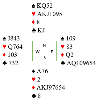 Det er en fin kløverfarge, men det er nokså tynt utenom. Makkerparet har kun 30 eller 31 HP til sammen, i minste laget for slem, men det er jo sannsynlig med fem kløverstikk. Det kan være en brukbar slem, men det kan også være nokså elendig hvis nord ikke har de riktige honnørene.