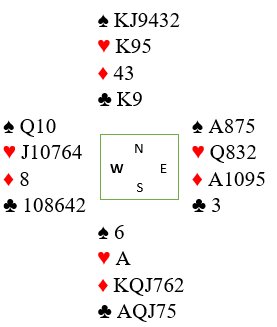 Og hjerter kom ut fra vest, men da nieren ble lagt fra nord feilet øst og la i damen. Det er riktig motspill kun om utspillet er liten fra AKxx(x). Å legge liten koster ikke stikk selv om syd har A-x hvor i så fall nieren vinner stikket, for da får han etter hvert to stikk i fargen om øst legger i damen også. Legges liten hjerter fra øst har forsvaret enkelt minst fem stikk.