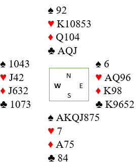 La oss si det kommer ruter ut. Spillefører går på trumfen, for sitter den 3-2 gjenstår kun å løse kløveren. Idet det oppdages at trumfen sitter skjevt kan ikke spillefører ta ut alle syds trumfer, for da blir det jo grandspill uten trumf på noen av hendene, og forsvaret får alle hjerterstikkene. Kløveren må angripes tidlig.