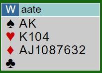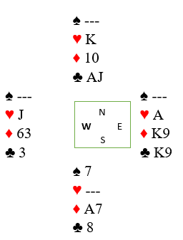 Da Holen fikk kløver ut til damen var det enkelt å få elleve, og kanskje kunne han få enda ett gyldent overstikk? Han tok tre runder trumf og spilte hjerter til tieren og østs dame. Øst var innspilt og måtte gi favør i en av de tre fargene, så ett overstikk er sikret. Litt uheldig (igjen) spilte øst ruter unna kongen. Husk øst så ikke nords kort, og ruterskift virket nokså normalt. Det gikk liten ruter fra syd, knekten fra vest og nords dame. Å legge i knekten ser også normalt ut fra den siden, men det skulle vise seg å koste enda ett stikk. En hjerter ble trumfet, så resten av trumfene. Øst kom mer og mer i trøbbel i dette motspillet som var en plage for han fra start til mål. Dette blir sluttposisjonen før den siste trumfen spilles:
