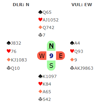 Nord åpnet med 2 hjerter som viste hjerter og en minor (under åpning). Allan (øst) meldte inn 3 kløver. Syd sa 3 hjerter, og etter pass-pass foreslo nordmannen 3 grand! Det er opplagt et forslag når det meldes i andre melderunde, øst kunne jo sagt 3 grand med det samme hvis han hadde hatt sterkere kort. Her hadde vest kløver dame som var et perfekt kort, og ruteren hans var heller ikke å forakte.