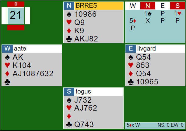 Terje smalt til med 5 ruter direkte, og nord doblet! Det skal ikke så veldig mye til hos øst før meldingen 5 ruter blir bra. Livgård hadde ikke mye, men det han hadde var verdifullt.