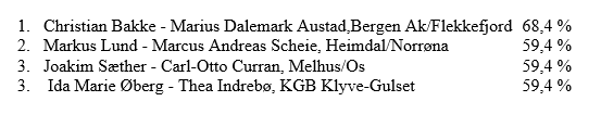 Om det ikke var særlig spenning om hvem som skulle vinne var det desto mer spennende i kampen om de andre medlajene. Tre par kom på akkurat samme prosentscore! Markus Lund-Marcus Andreas Scheie hadde imidlertid 0,2 matchpoints (!) mer enn de to andre og fikk sølvmedaljene. Slik ble pallen seende ut: