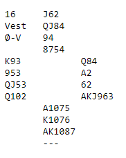 I 5hj x kom spar Q ut fra syd. I frykt for å miste overgangene hvis trumfen sitter 3-1 velger jeg derfor å satse alt på 2-2-sits. Jeg topper derfor hjerteren, med suksess. Nå var det bare å etablere kløveren, så var jeg hjemme med 11 stikk. Hvem skulle trodd at 17 hp tilsammen i makkerskapet skulle være nok til 11 stikk?!