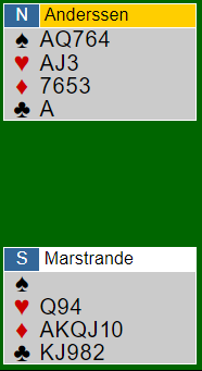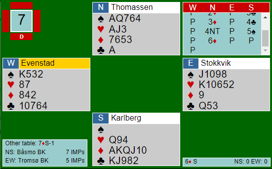 Tromsø meldte 7 ruter, Båsmo var i 6 ruter. Kløveren satt snilt og lot seg godspille, men da spar konge ikke satt tredje (eller dobbel) og hjerter konge var plassert hos øst ble det en bet i storeslemmen. Med +1370 og +100 til Båsmo ga spillet hele 16 IMP.