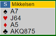 Mikkelsen hoppet rett til 3 grand. Sprekt, men jeg må innrømme jeg har sansen for meldingen som dog er en gambling fordi kløveren er jo ikke gående. Hvis du hadde fått vite at nord har dobbelton kløver, vil du da tatt sjansen på 3 grand?