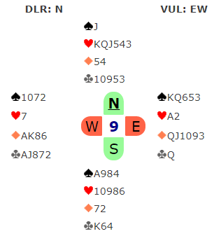 Ved det andre bordet åpnet Harald Eide (nord) med 3 hjerter som etter min mening er passelig. Da hadde øst til å melde inn 3 spar, pass blir alt for spedt med dette. Alternativet ville vært 4 ruter, såkalt non-leaping Michaels som nok er litt en overmelding av kortene. Og hadde det blitt meldt ville de trolig havnet i 6 ruter spilt av vest. Da ville det antagelig blitt bet ganske enkelt etter spar knekt i utspill og med østs kort som blindemann. Men etter østs 3 spar fra øst sa Blågestad 5 hjerter, og nå måtte vest ta stilling til 5 eller 6 spar. Cecilia Rimstedt nøyde seg med 5 spar som var korrekt siden både 6 ruter og 6 spar er bet. 5 spar stod akkurat, det ble to trumftapere. Men det hjalp ikke å ta riktig avgjørelse her, det ble likevel 12 IMP til det norske laget.