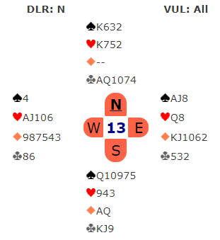 Over vests 4 ruter, riktig eller feil, meldte ISRAEL sin nord 4 spar. Syd hadde sannelig et problem der og, men besinnet seg og passet. Vest passet også, og det er på en måte konsekvensen av å si 4 ruter og ikke 5 ruter første gangen.