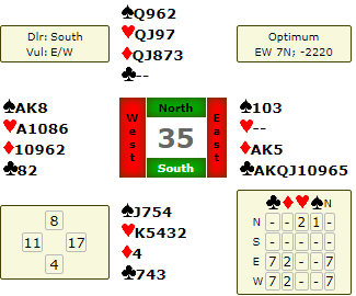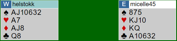 Motparten meldte ikke. Idet vest krevde til utgang (XY) etter østs gjenmelding 1 grand (1K-1S, 1NT) viste øst sparstøtte. Nå meldte vest 3 spar som en (liten) sleminvitt. De endte i 6 spar.