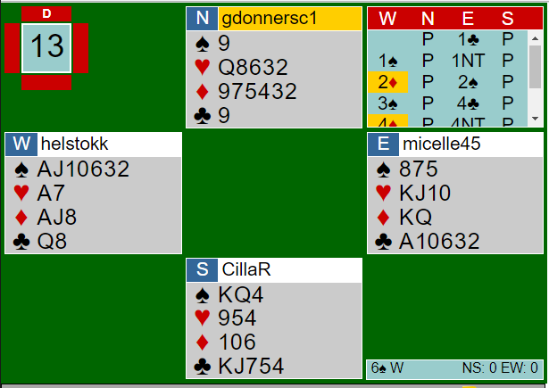 Ved det andre bordet stoppet Ø/V i 4 spar. I den kontrakten var det ikke så interessant, og spillefører fikk en kløvertaper og to trumftapere, +620 til DONNER. Dermed ga spillet 13 IMP til lag LEVINE.