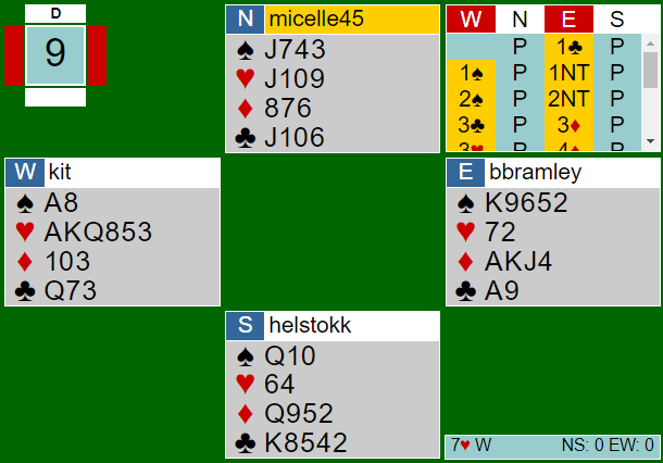 Første spillet var som det pleier fra den kanten: Sosemikkelens makker åpnet 1 kløver i første hånd, og sosemikkelen sjøl svarte av 1NT. Så hoppet makkeren til 3NT, en melding som stort sett viste 18-19p og en rund hånd, og der døde det: