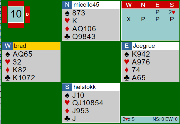 Noen åpner med slikt, men Grue passet. Helness (syd) åpnet med svake 2 hjerter. Moss (vest) doblet opplysende, og nord sa pass. Hva ville du meldt nå?