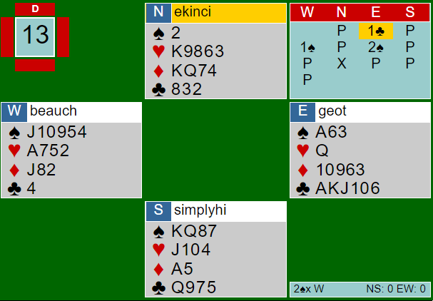Det gjorde den ikke da øst hadde sikkert trumfstikk, og dessuten satt alt det andre helskjevt med singel ruter hos vest, og dobbel hjerter hos øst. Kontrakten kollapset fullstendig, fire bet. Det ga nok et tosifret tapsspill for det tyrkiske laget, 12 IMP.