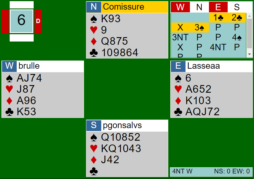 Det så ut som kun ni stikk fra taket, men det er hvis det blir fem kløverstikk. Spar 3 kom ut til damen og esset. En kløver ble spilt til bordet til liten fra nord og honnør, og den nitriste sitsen i fargen ble oppdaget. Da var det kun åtte sikre stikk.