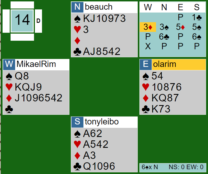 Min lagkamerat på syds plass som spilte mot svenskene Mikael og Ola Rimstedt sa imidlertid 5 spar, ikke en urimelig melding. Da foreslo nord 6 kløver, øst passet og det var syds tur igjen.