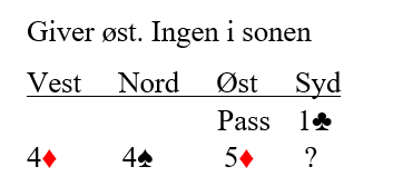 Her er det viktig med noen avtaler. Det kan virke naturlig å si 5 spar. Et alternativ med ingen i sonen er å doble. De må vel bli minst 300, kanskje mer. Det er kanskje ikke så sannsynlig vi har slem i kortene?