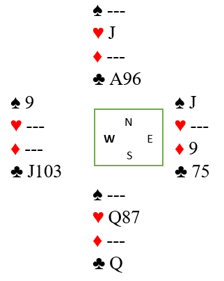 Ta ut trumfen og innkasser den andre hjerterhonnøren. Så spilles E-K i ruter og nok en ruter. Da har situasjonen blitt slik siden ruter satt 3-3: