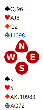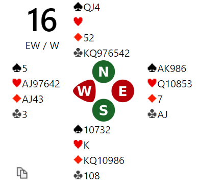 Den tyske nord åpnet, og øst meldte inn 1 spar. Deretter blåste N/S ut i 6 ruter.