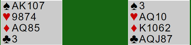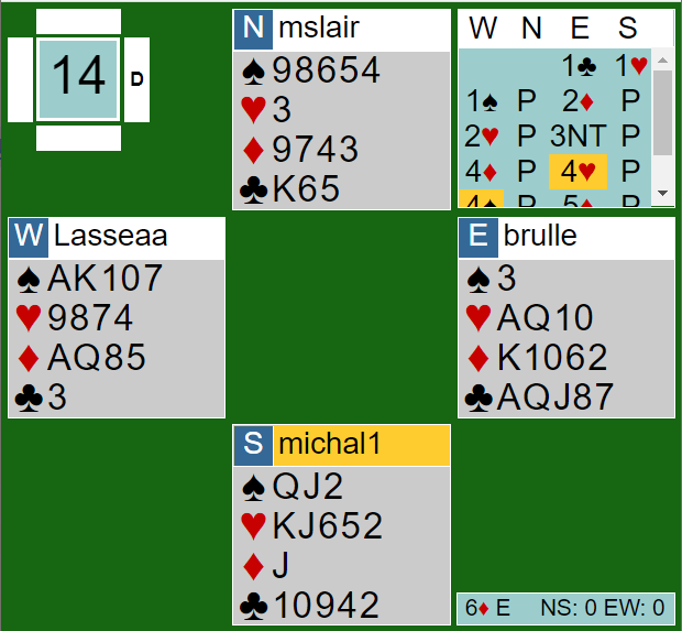 To par meldte 7 ruter. En gikk bet, men amerikaneren Graig Ganzer tok kløverfinesse over nord, satte opp kløveren og skviset til slutt hjem tretten stikk i 7 ruter, +1440!