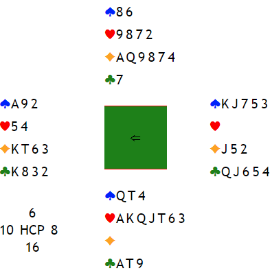 Vest spilte ut trumf, og syd – en ganske rutinert spiller - ble antagelig utsatt for de nevnte negative tankene fordi det ser ut som to åpenbare tapere i spar. "Hvordan er det du melder makker!"