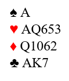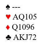 Med mindre enn disse eller lignende hender og kun damen på topp i ruter er han neppe sterk nok til storslemsinvitt da din 5 ruter er meldt i en nokså presset situasjon.
