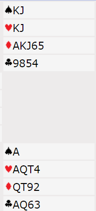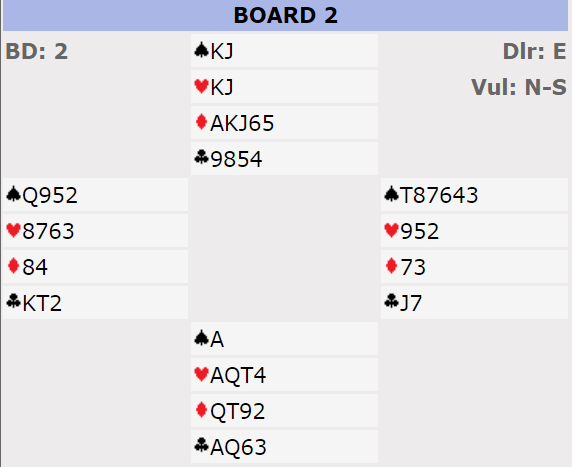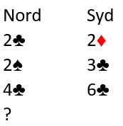 Jeg kunne jo tatt med makker litt på råd og sagt 5NT. Med kløver konge kunne han i så fall sagt 6 kløver, og melder han 6 ruter over 5NT bør antagelig nord passe. Men om syd mangler kløver konge står som sagt storeslemmen likevel hvis han har femkorts hjerter, eller som her om kløver konge sitter i saks.