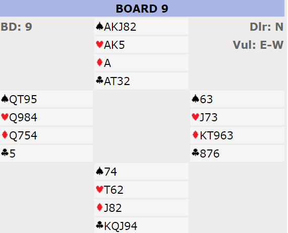 Øst hadde vært litt frekk og hadde ikke de foreskrevne 6-10 for åpningen sin, og kløver konge satt bak. Dermed ble det en bet og nitriste 9% på spillet.