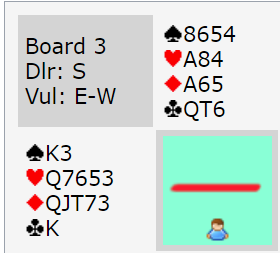 3 ruter var utganhskrav, 4 kl Cue og svaret på 5- ess Blackwood viste 2 ess (av de 5, hj K= ess samt hj D og 6 ruter var forslag til alternativ kontrakt. Tone Annette Olsen (S) og undertegnede (N) kom i samme lilleslem med start 1 hj- 1 sp og jeg hoppet så til 4 hjerter. Da tok makker fatt i saken og via 5-ess BK var vi fort i slem. En ga 51-3 i score, ett par sjanset i 6 NT og fikk utrolig nok 12 stikk etter kl K i utspill. Da er det jo bare 9 stikk der!