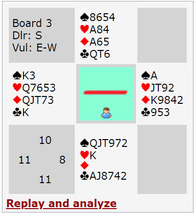Vest vet med andre ord at øst må kunne stikke spar 8 og bør legge liten. Da spillet forekom så imidlertid vest ikke særlig lenger enn sin egen nesetipp i dette spillet og hoppet på med kongen. Og da skjedde akkurat det han fortjente:
