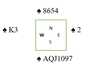 Spillefører har åpnet med 1 spar og har åpenbart en voldsom fordelingshånd da han var den som «tok av» og meldte slem. Siden trumfesset ikke kom opp på bordet (nord) har du et sikkert trumfstikk. Må du ta det nå?