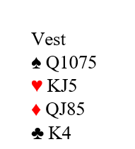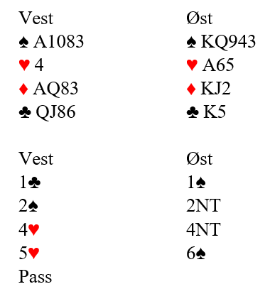 Snakk om destruktiv åpning av syd! Men ingen blir lengre arrestert på 2-trinnet, og i gjettekonkurransen ble 3 NT en grei sluttkontrakt, men med et uheldig sluttresultat. Ved de andre bordene hadde det selvfølgelig ikke gått slik. Nord hadde som oftest meldt av ruteren sin, og det endte i minor-delkontrakt den ene eller andre veien.