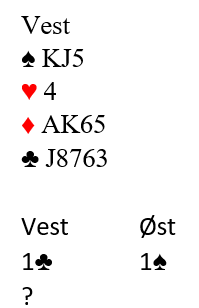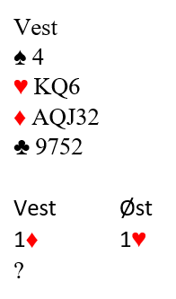 Først og fremst blir min anbefaling å nesten alltid gjenmelde 1NT med jevn fordeling med mindre man har fire kort i svarers farge. Det er særlig med ubalanserte hender det er fristende, og trolig i det lange løp det beste å høyne svarfargen. Her er et eksempel på den mest opplagte håndtypen hvor en slik støttemelding er bedre enn alternativene, du har:
