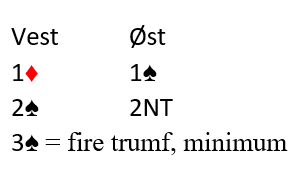 Minimum er altså innenfor det intervallet han vist så langt, så dette viser en helt minimums åpning, 12-13, kanskje 11 poeng av og til. Hvis 2NT meldingen er avtalt som «minst invitt» kan makkerparet stoppe i 3 spar nå.