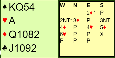 Du ser på at meldingsforløpet tar av etter at østs 2 ruter var forklart som en Multi-variant, og det er klart nå at han har sekskorts hjerter. Etter at du et øyeblikk trodde egen side hadde kortene melder motparten slem! Naturlig nok dobler du 6 hjerter med disse kortene, makker har tross alt meldt han også, men hva spiller du ut?