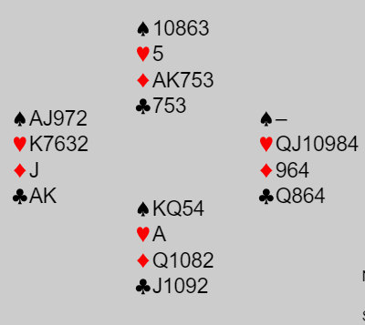 Spar ess vant første stikk. Ess-konge i kløver ble spilt, så spar til stjeling hos øst og kløver dame med avkast av ruter knekt. Nå var det bare ett stikk å hente for N/S, +1660 til Ø/V.