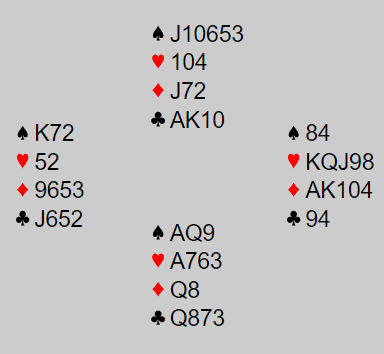 Syd meldte pass, og det var vest. Nå meldte han veldig hardt da han sa 3 spar, men både trumtilpasning og tilpasning til makkerens sidefarge i minor samt en dobbelton er jo litt verdier. Men det var ikke den tøffe hoppmeldingen som gjorde at det gikk galt. Over 3 spar fra vest sa øst 4 hjerter.