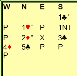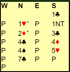 "Alt" var feil i antagelsene her, og det er klart at dette er en ren ulykke. Vest må ha "glemt" at N/S spilte kløverføringer, så nords 1 hjerter viste spar! Og følgelig var 2 hjerter naturlig.