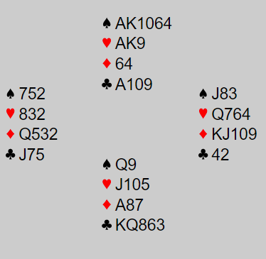 Svaret 1 hjerter viste fortsatt 4+ spar for N/S, og over syds 1NT var 2 ruter XY-NT, kunstig utgangskrav. Syd meldte nå 3 kløver som viste femkorts kløverfarge. Nord løftet kløveren som sleminvitt. Da syd viste ruterkontroll sa nord 4 spar som de bruker som Key Card Blackwood. Syd viste to nøkkelkort (kløver konge og ruter ess) samt trumf dame. Dette er en god meldesekvens så langt, men det måp vel være lov å si at nords konklusjon - 7 kløver - er steinhardt meldt.